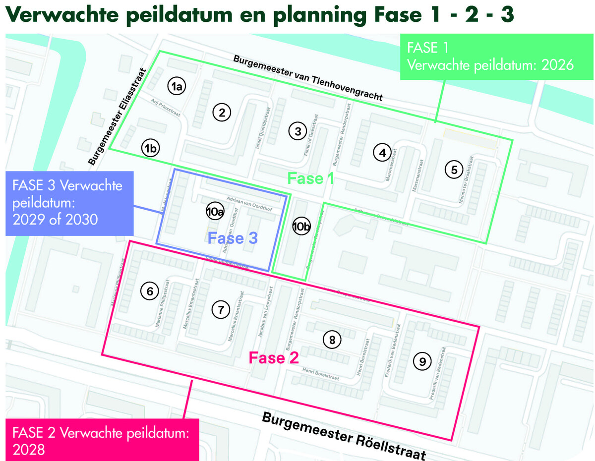 De planning kent 3 fasen. Hieronder staat voor elke fase wanneer we ongeveer de peildatum verwachten. Op de peildatum krijgt u stadsvernieuwingsurgentie en kunt u met voorrang verhuizen. Daar heeft u 1,5 jaar de tijd voor. Dit heet herhuisvesting.
